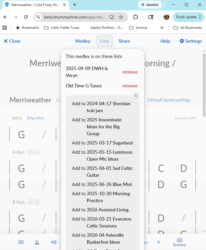 (2) If you have a lot of lists of tunes and are adding a medley or a tune to a list, you cannot scroll through the lists. In this particular case, I’d like to add this medley to a new list. I can solve this problem by using the Windows app or the released version of the web app.