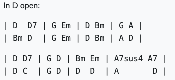 | D D7 | G D | Bm Em | A7sus4 A7 |